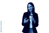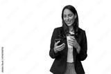 Professional woman smiling, using mobile phone, drinking coffee, standing on transparent background