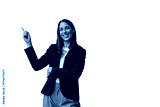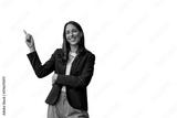 Businesswoman smiling, pointing finger up, indicating direction, presenting copy space on transparent background