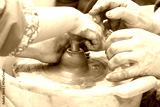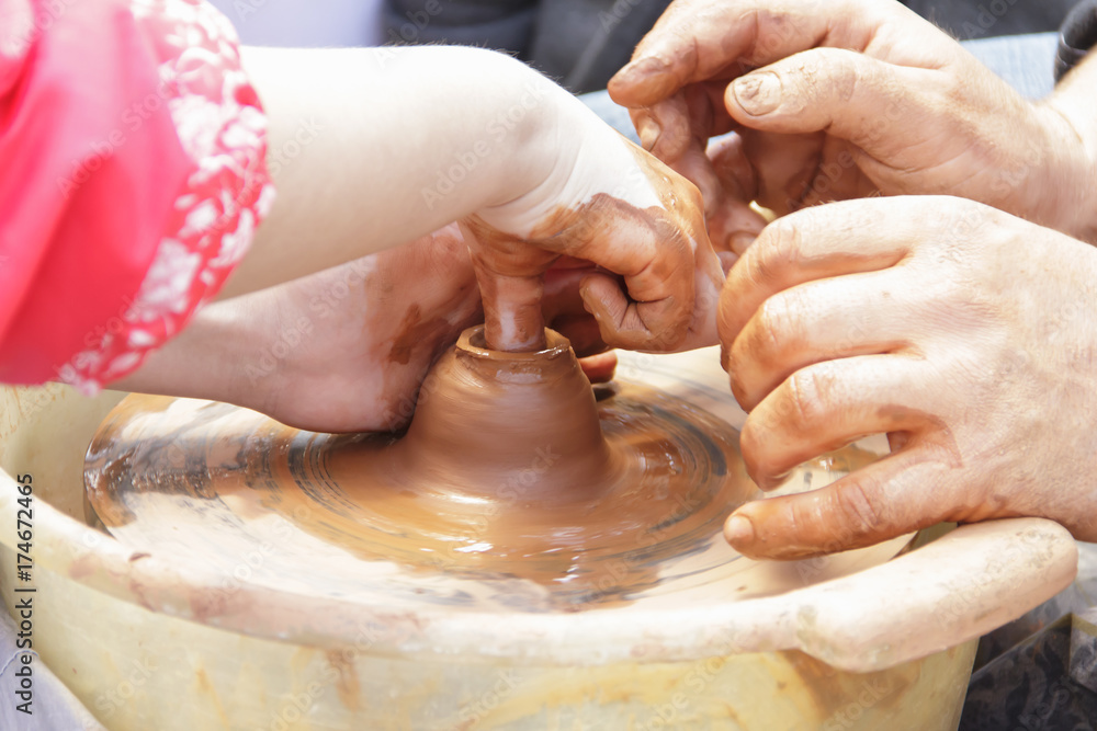 Master potter teaches the child how to make a pitcher on a pottery wheel