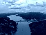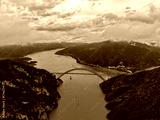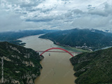 Yichang Three Gorges China landscape shows a red bridge spanning a wide river valley surrounded by green mountains under a cloudy sky.