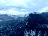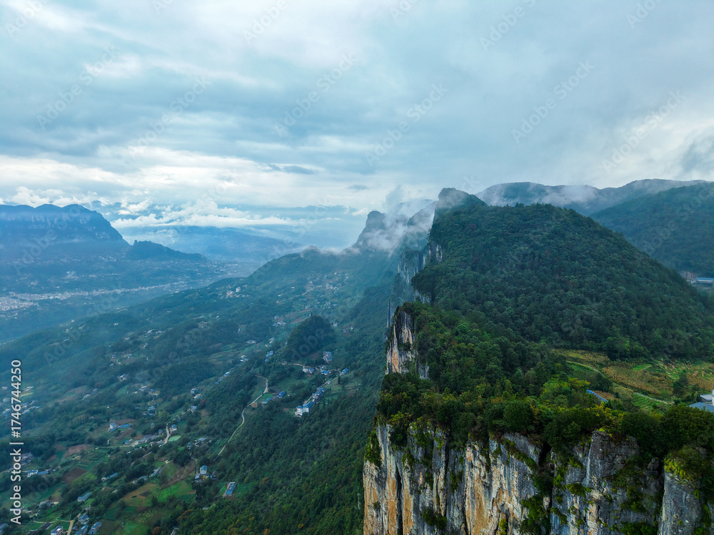Majestic cliffs rise above green valleys in Enshi City, Hubei Province, with clouds swirling around rugged mountain peaks under a vast sky, showcasing natural beauty and dramatic landscapes.