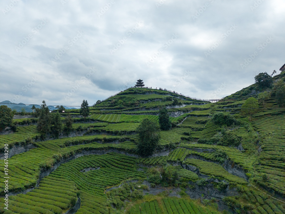 Terraced tea fields ascend Xuan'en County hills under a cloudy sky, a pagoda crowns the highest peak.