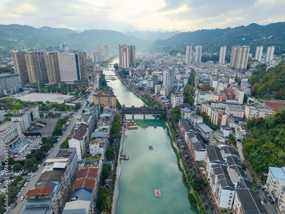 Xuan'en County, Hubei Province, China, shows buildings and a river stretching towards distant mountains under a cloudy sky.