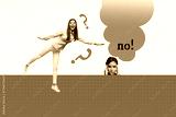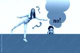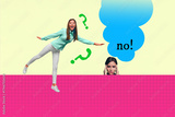 Banner 3d art pop image collage of happy businesswoman businessman answer question no ponder idea brainstorm strategy plan