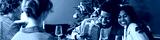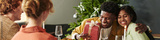 Young Black man hugging young Asian woman while holding wrapped gift, sitting at festive table with two Caucasian women, celebrating Christmas together in front of decorated tree