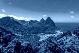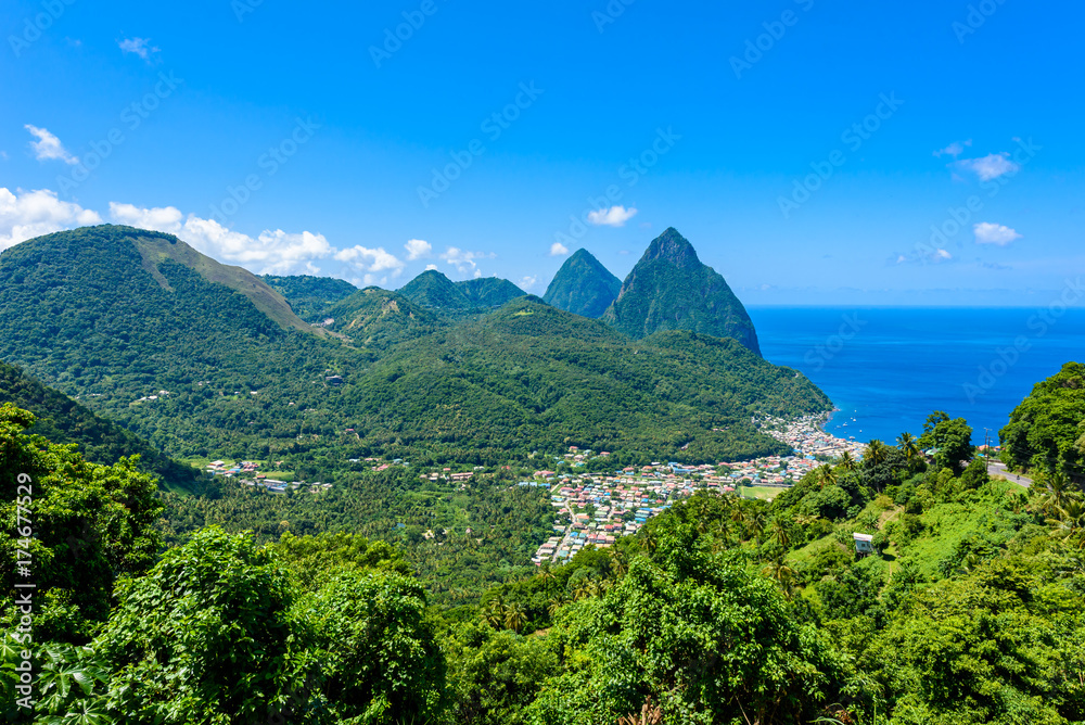 Gros and Petit Pitons near village Soufriere on Caribbean island St Lucia - tropical and paradise landscape scenery on Saint Lucia