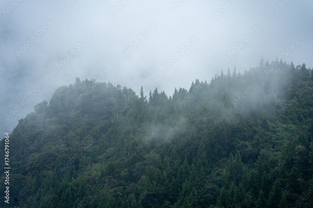 A dense forest covers a misty mountain slope in Yichang City, China, creating a serene natural landscape.