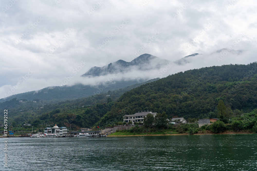 Mountains rise behind a serene lake near Yichang City, China, with buildings nestled along the shore under a cloudy sky.