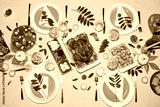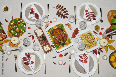 Top view of Thanksgiving table setting featuring roasted whole chicken and appetizers with plates decorated with autumn leaves