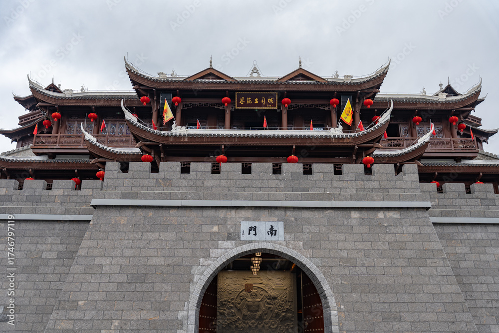Ancient city gate with layered roofs and red lanterns stands tall in Enshi, China under a cloudy sky, showing traditional architecture.