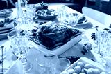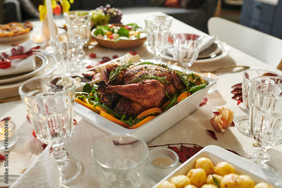 Roasted whole turkey garnished with herbs and orange slices sitting in dish surrounded by glassware, salad, potatoes, and Thanksgiving table setting prepared for holiday meal