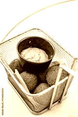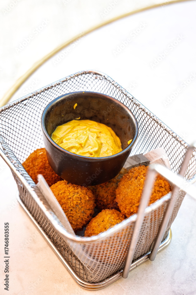 Famous Dutch street food Bitterballen served at a cafe with some mustard sauce. Top down, close up shot, no people