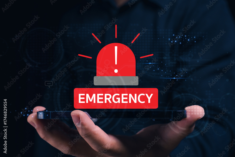 A hand holds a smartphone displaying an emergency alert symbol, indicating a call for urgent attention or response in digital communication.
