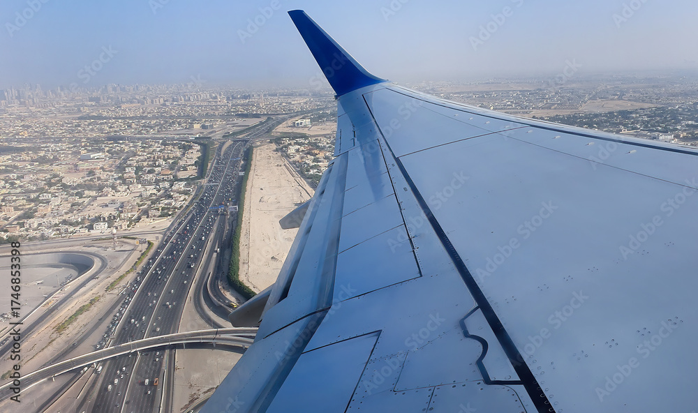 Aerial view of middle east landscape against the sand color sky, City landscape on ground below and the airplane wing