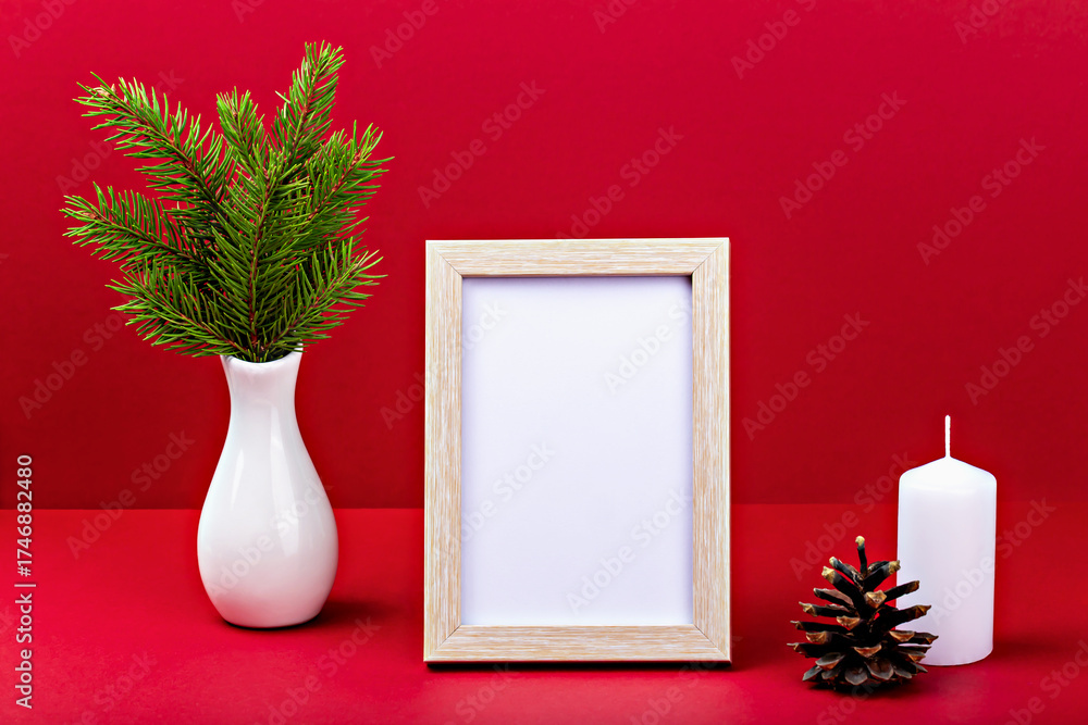 Mockup. Christmas. Decorative arrangement featuring empty wooden frame, fresh pine branches in white vase, white candle and pine cone on vibrant red background, creating festive atmosphere