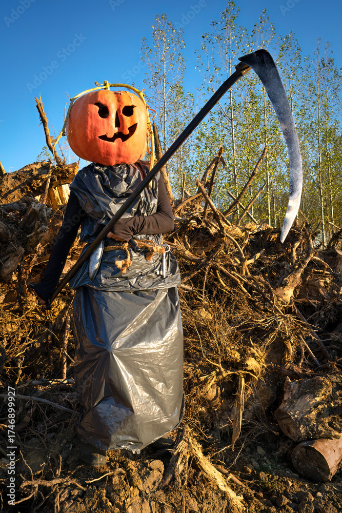 halloween monster pumpkinhead in forest at dusk with a scythe in galician samain or ireland samahin fest , real photograph