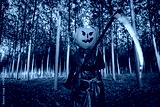 halloween monster pumpkinhead in forest at dusk with a scythe in galician samain or ireland samahin fest , real photograph