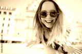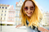 Charming young girl in sunglasses against the backdrop of a beautiful old building.