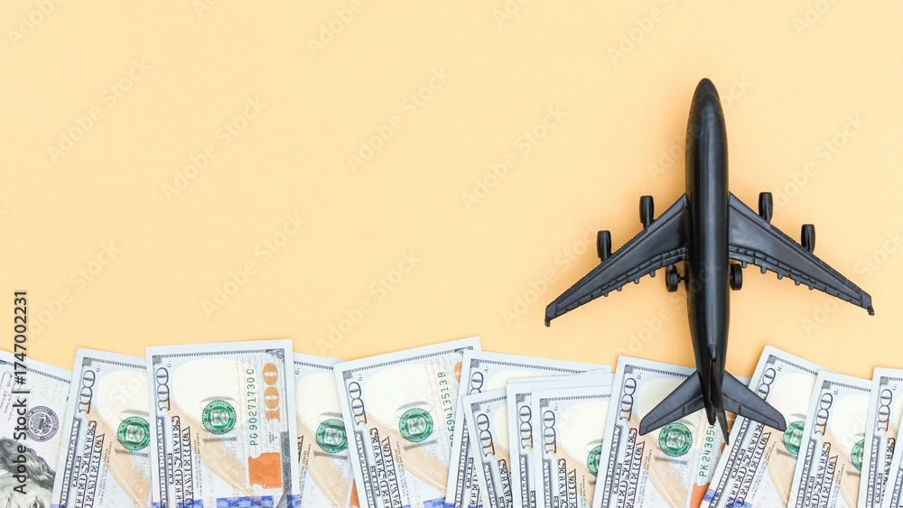 Flight expenses. Airplane over dollars isolated on pastel background. Travel cost concept.