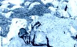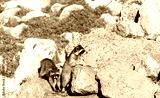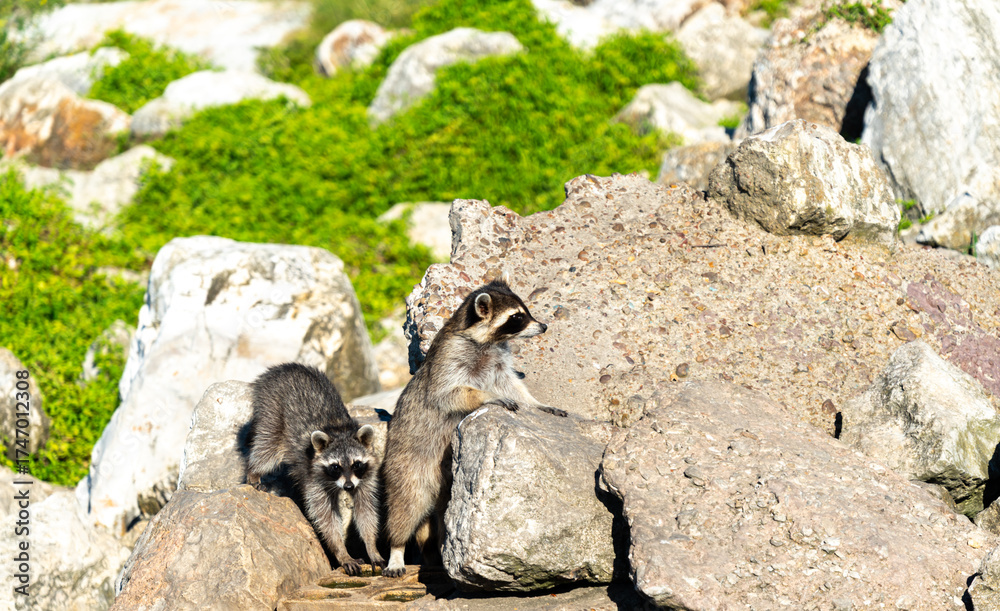 Two curious raccoons explore sunlit rocks amid green vegetation in daylight.