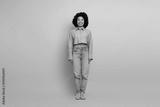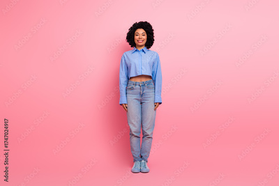 Smiling young woman wearing stylish casual clothing standing confidently against a vibrant pink background in studio setting