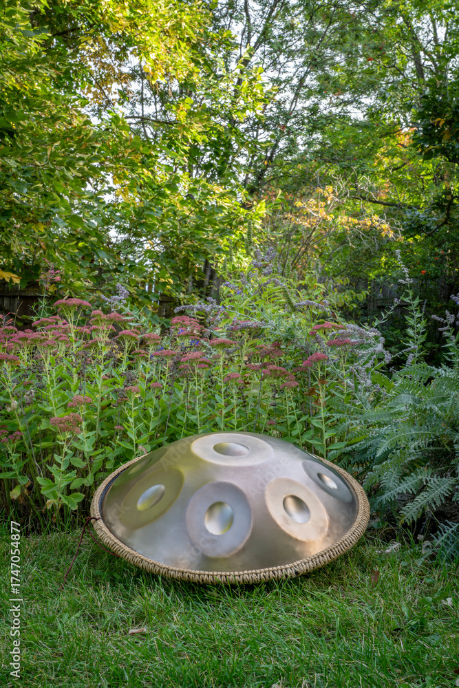 handpan drum outdoors in a backyard, a modern, melodic percussion instrument made of steel, known for its soothing, resonant tones