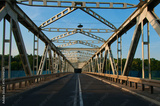 Nowa Sól - Stalowy most kratownicowy rozciąga się nad rzeką Odrą w ciągu drogi nr 315, otoczony niebieskimi barierkami i bujnymi drzewami. Ciepłe światło podkreśla detale konstrukcyjne.