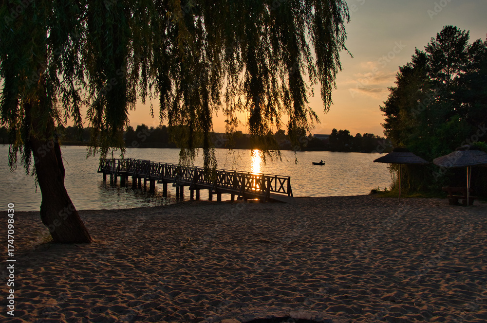 Spokojny zachód słońca nad jeziorem, z drewnianym pomostem, piaszczystą plażą i zwisającymi gałęziami wierzby. Łódź z samotnym rybakiem w oddali sunie po spokojnej wodzie, a złote światło odbija się.