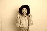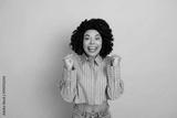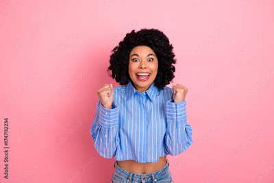 Cheerful young woman celebrates with joyful expression while standing against a vibrant pink background.