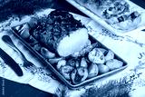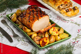Festive Christmas dinner. Glazed roast pork with whole cloves, served baked potatoes. Mushroom Pie on background.