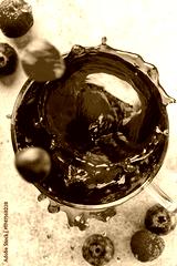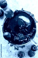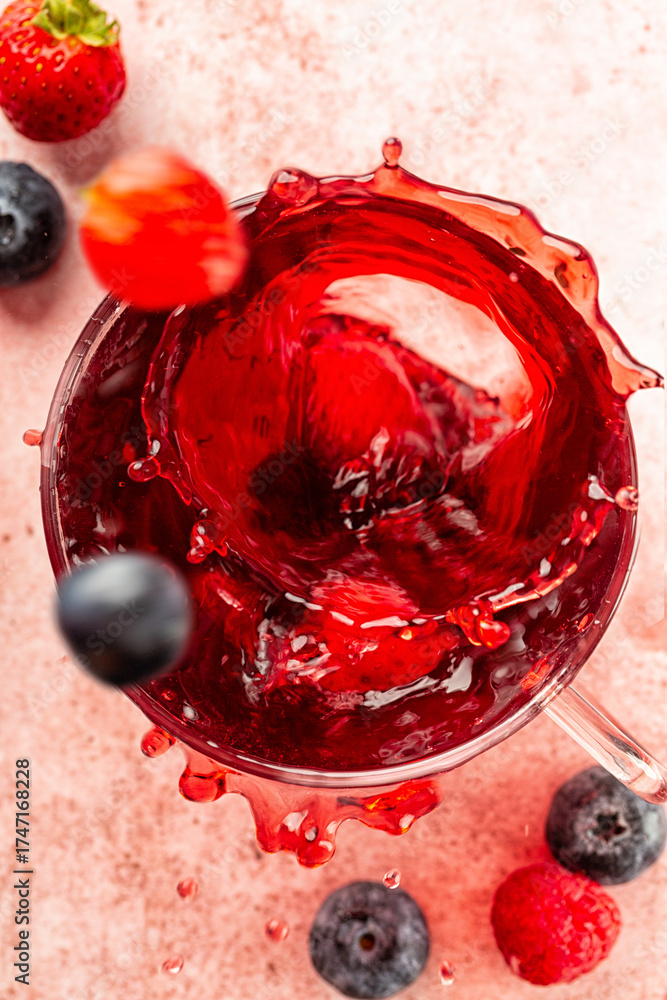 Dynamic photo of berry drink with splash, flowing blueberries and strawberries. Top view.