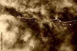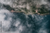 Fog covering mountains and water while showing traditional floating houses on Drina river in Tara natural park with a winding road along