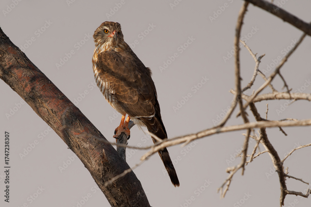 Gabar Goshawk - Micronisus gabar small African and Arabian bird of prey in the family ccipitridae, grey body and yellow beak, sitting on the branch in NP Etosha in Namibia