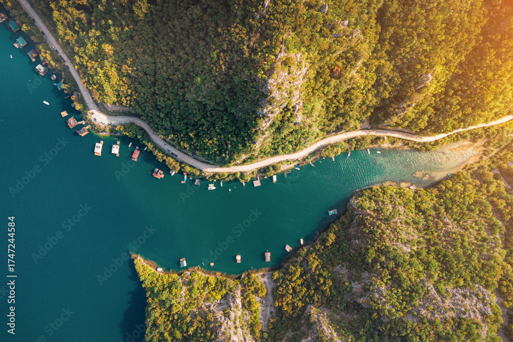 Aerial view showing houseboats along the Drina river shoreline next to a winding road and lush green forest, sunlit