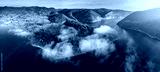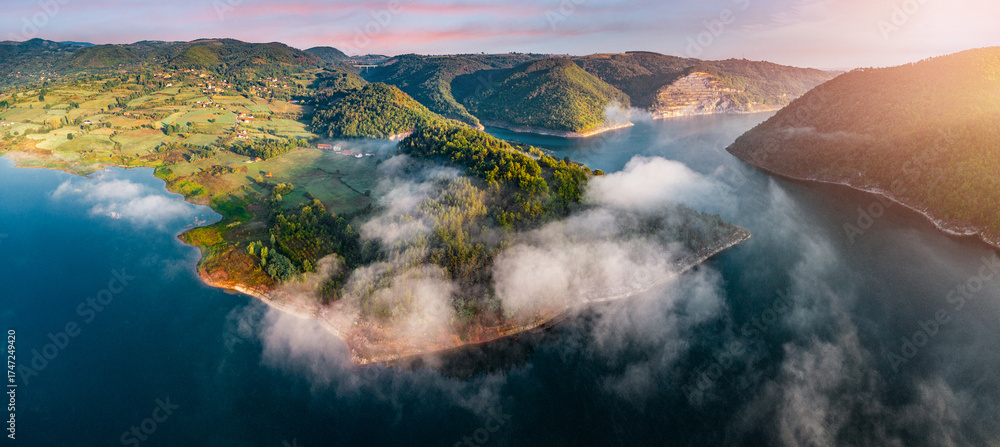 Hills and forests immersing a calm lake with ethereal fog during an orange sunrise, creating a serene panoramic landscape
