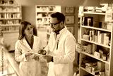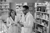 Happy pharmacist and his female colleague working on touchpad in drugstore.