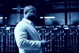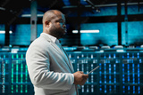 Data center admin monitoring thermal levels using tablet, doing checkup to prolong hardware life span. Server hub worker monitoring infrastructure rigs, reviewing configurations