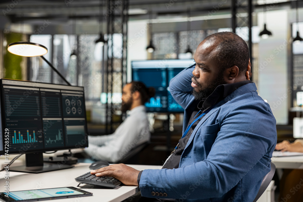 African american executive manager in a brainstorming session, searching for new ideas to increase business capital funds. Consultant reviewing analytics and infographics for solutions.