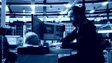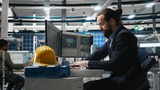 Professional engineer reviewing insight on pc at the solar panels plant, conducting an inspection to ensure alternative energy systems for production line and development goals. Camera A.