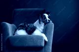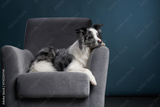A border collie lies across a dark grey chair in a resting yet alert posture.