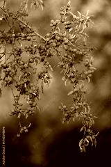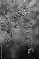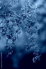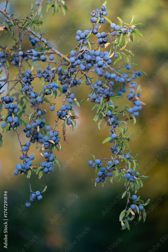 Blue blackthorn (Prunus spinosa) grows on a branch in autumn. Many berries can be seen. The evening sun shines softly in the background.
