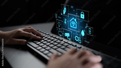 Concept of a smart home and the Internet of Things (IoT). A central system controls home automation features like security, lighting, and climate for modern, convenient living. Fermion