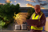 Engineer in reflective vest checking data on laptop near outdoor air conditioning units, concept of HVAC maintenance, ventilation, heating and cooling systems. HVAC.