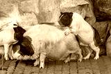 Domestic pigs copulate in the yard by the stone wall