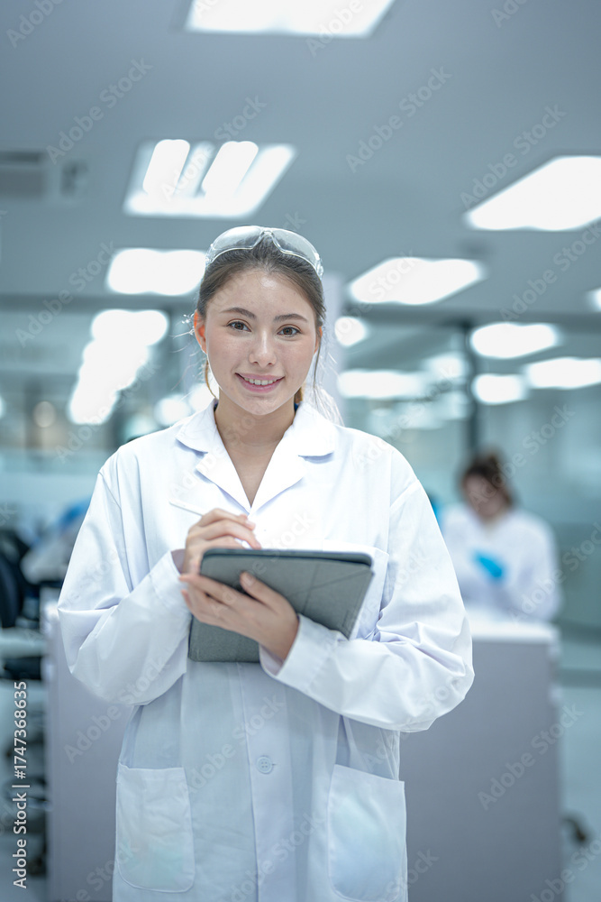 A Clinical Research Coordinator uses a tablet for electronic data capture, managing patient eCRFs and ensuring data integrity for a clinical trial in a modern research facility.