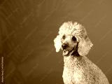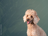 A curly-haired poodle is photographed in front of a green background, smiling. The dog's expressive eyes and fluffy fur add warmth to the image.