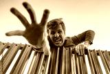 Angry man climbs furiously over the fence, breaking the boundaries of private property and pulling his hand down