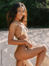 Smiles gorgeous woman in bikini posing on sandy beach