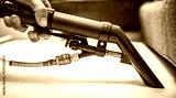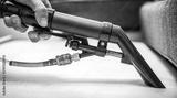Side view of hand cleaning white couch with professional spray cleaner and vacuum machine for home hygiene