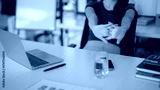 Asian adult woman stretching hands at modern office desk during work break promoting wellness ergonomics and productivity for business professionals
